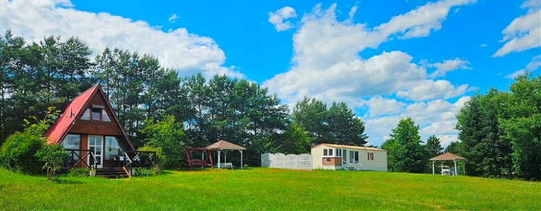 Domek typu Brda - 6 miejsc noclegowych. Znajdują się tam dwie sypialnie - jedna z podwójnym łóżkiem, druga sypialnia z dwoma pojedynczymi łóżkami, salon z kanapą rozkładaną na dwie osoby, aneks kuchenny, łazienka z prysznicem. Przy domku znajduje się wiata z grillem do dyspozycji wyłącznie dla mieszkańców domku.